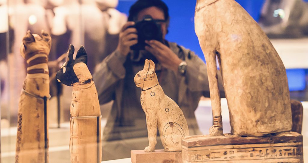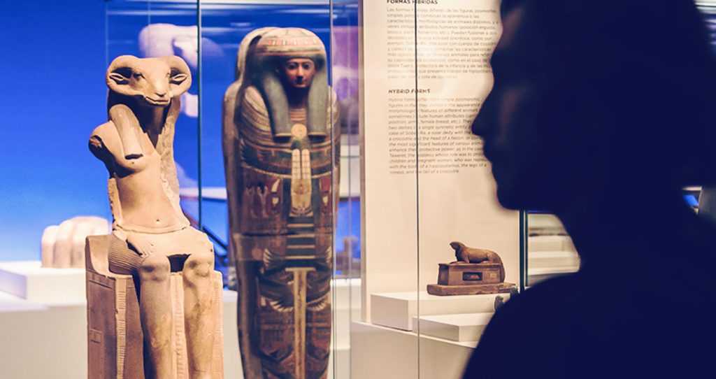 Aquesta exposició reuneix una selecció de 430 objectes que expliquen aquesta intensa relació a partir d’esfinxs i estàtues —algunes de les quals, de grans dimensions— esteles, gots, gerres, aquarel·les, pintures murals, cofres, amulets, sarcòfags i mòmies. De fet, la mostra inclou 14 exemplars de mòmies animals que s’han estudiat expressament per a l’ocasió, de la mateixa manera que 260 objectes s’han restaurat per a l’exhibició.