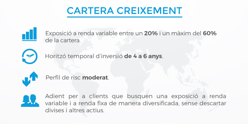 Quantes carteres diferents hi ha? A partir dels objectius que vostè mateix marqui, el seu horitzó temporal i el risc que vulgui assumir, pot triar entre tres productes: Cartera Equilibrio Plus, Cartera Crecimiento Plus o Cartera Oportunidad Plus.