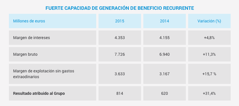 Al crecimiento del margen de intereses se une el buen comportamiento de las comisiones, debido en gran parte a la mayor aportación de los productos de fuera de balance (seguros de ahorro, fondos de inversión y planes de pensiones), que contribuye al incremento del margen bruto (+11,3 % respecto al 2014).