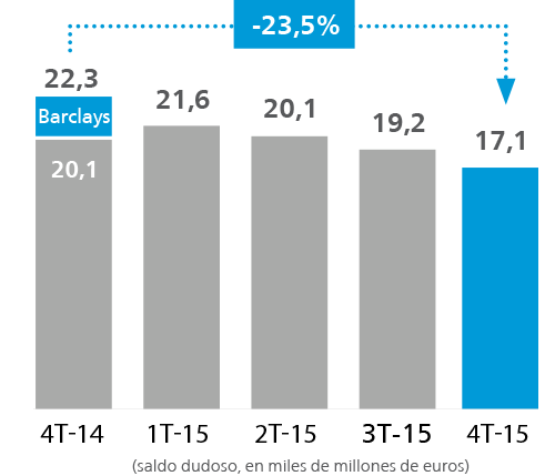 La ratio de morosidad continúa su descenso hasta situarse en el 7,9 % (frente el 9,9 % al cierre del 2014), y cae en todos los segmentos (particulares, empresas y promotores). La ratio de morosidad sin actividad inmobiliaria se sitúa en el 6,2 %. Las coberturas, por su parte, se mantienen elevadas (56 % del crédito dudoso provisionado, a diciembre del 2015).
